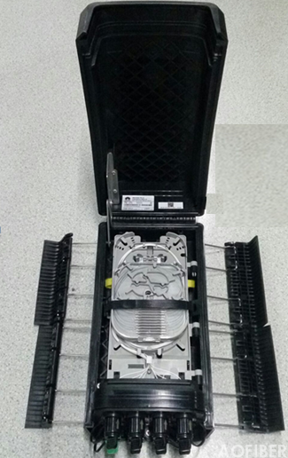 此款采用高强度增韧PP材料,最底层熔接盘放置器件(可配置1:8分光器),配线光缆的直通、分歧;光纤的熔接;分光;入户光缆的端接
